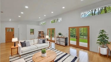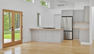 The kitchen offers both style and practicality with butcher block countertops and soft-closing cabinets. The primary bathroom includes a custom-tiled shower, while the main bathroom features a deep soaking tub for relaxation. French doors in the living room open onto a spacious cedar deck, extending the living space and providing the perfect setting for outdoor gatherings.